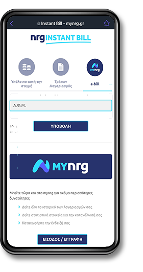 Η υπηρεσία nrg INSTANT BILL παρέχεται εντελώς δωρεάν σε όλους τους πελάτες της nrg που επιλέγουν e-bill! Μπείτε στο mynrg από τον υπολογιστή ή το κινητό σας και επιλέξτε να λαμβάνετε e-bill με e-mail ή SMS, ανάλογα με την προτίμηση σας!